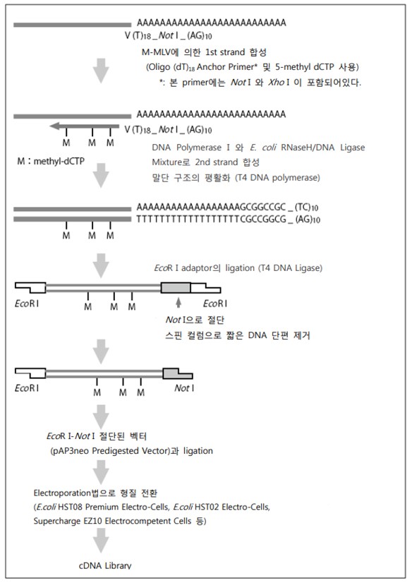 mRNA는 세포에서 단백질을 만들기 위한 유전 정보만을 포함하고 있지만, RNA는 불안정하고 실험에 사용하기 어려워서, 안정적인 형태의DNA로 바꾸어 사용합니다. 바로 이때 만드는 것이 cDNA입니다.