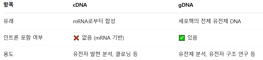 cDNA란, complementary DNA의 약자로, 상보적 DNA라고 합니다. 이는 mRNA(전령 RNA)로부터 역전사 효소(reverse transcriptase)를 이용해 합성한 DNA입니다.DNA는 두 종류(단백질 합성 코드를 가지고 있는 엑손(exon), 가지고 있지 않은 인트론(intron))의 서열로 이루어져 있는데, cDNA는 인트론(intron)이 존재하지 않는 DNA서열입니다. 즉, 단백질 합성에 필요한 정보만을 가진 DNA서열입니다. 왜 cDNA를 만들까?mRNA는 세포에서 단백질을 만들기 위한 유전 정보만을 포함하고 있지만, RNA는 불안정하고 실험에 사용하기 어려워서, 안정적인 형태의DNA로 바꾸어 사용합니다. 바로 이때 만드는 것이 cDNA입니다. ice, PCR machine..